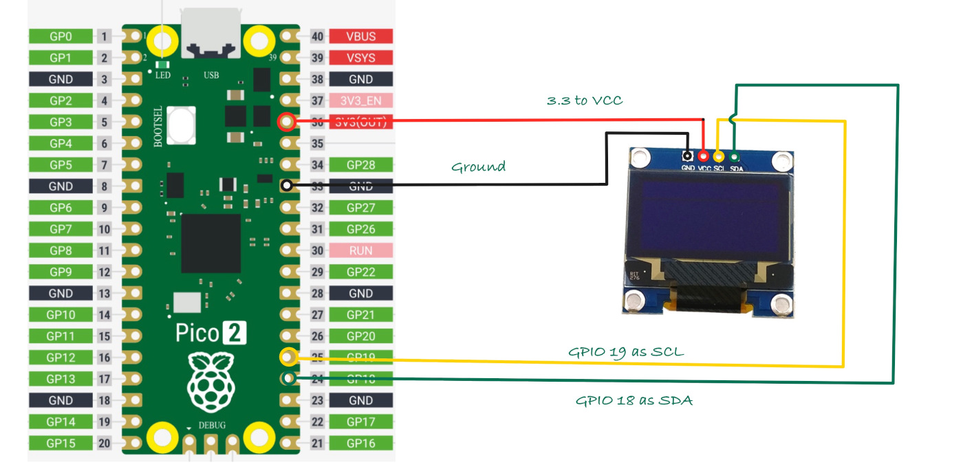 I2C 使用两条信号线:SDA(数据)和 SCL(时钟)。所有设备共享这两条线,每个设备有唯一地址,Pico 2 可通过同一对线与多个设备通信。
