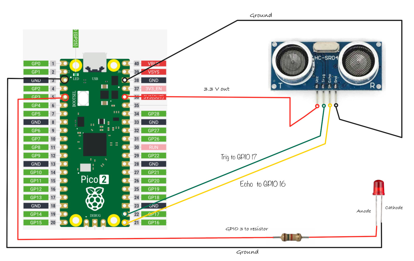 GND 引脚用于完成电路并连接到系统接地。Pico 2 在板上提供多个 GND 引脚,便于连接外设时接地。